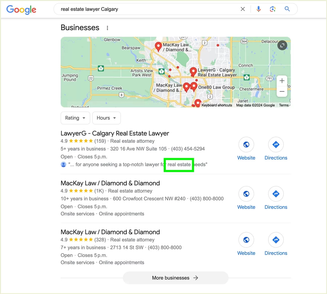 Google uses keywords within Google Reviews to confirm the services or products offered by a business. For example, when conducting a search for ‘real estate lawyer Calgary,’ the top Google Business Profile result may feature a relevant Google Review containing the keyword phrase ‘real estate.’ This inclusion helps Google recognize and associate the business with ‘real estate’ law services.