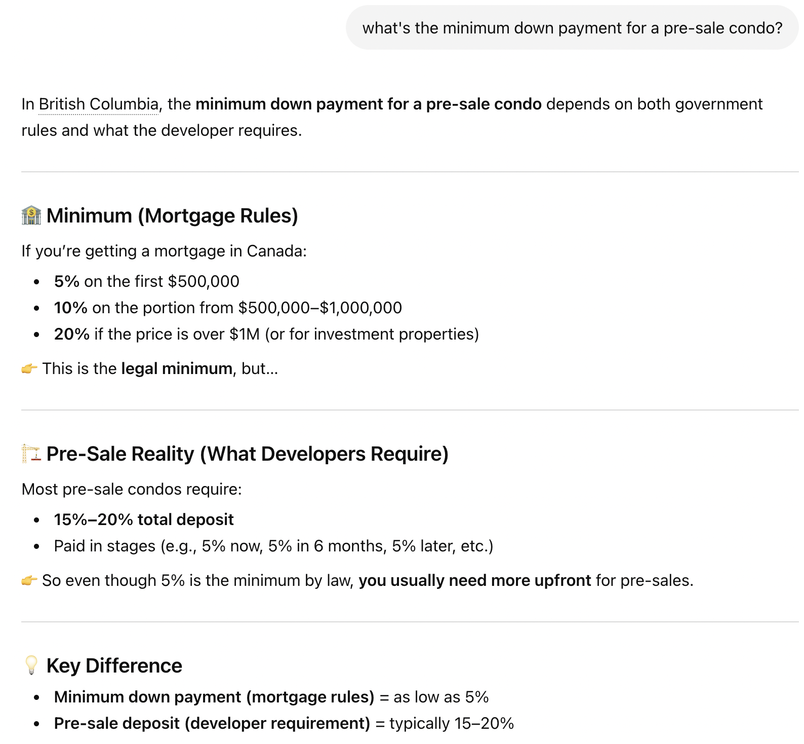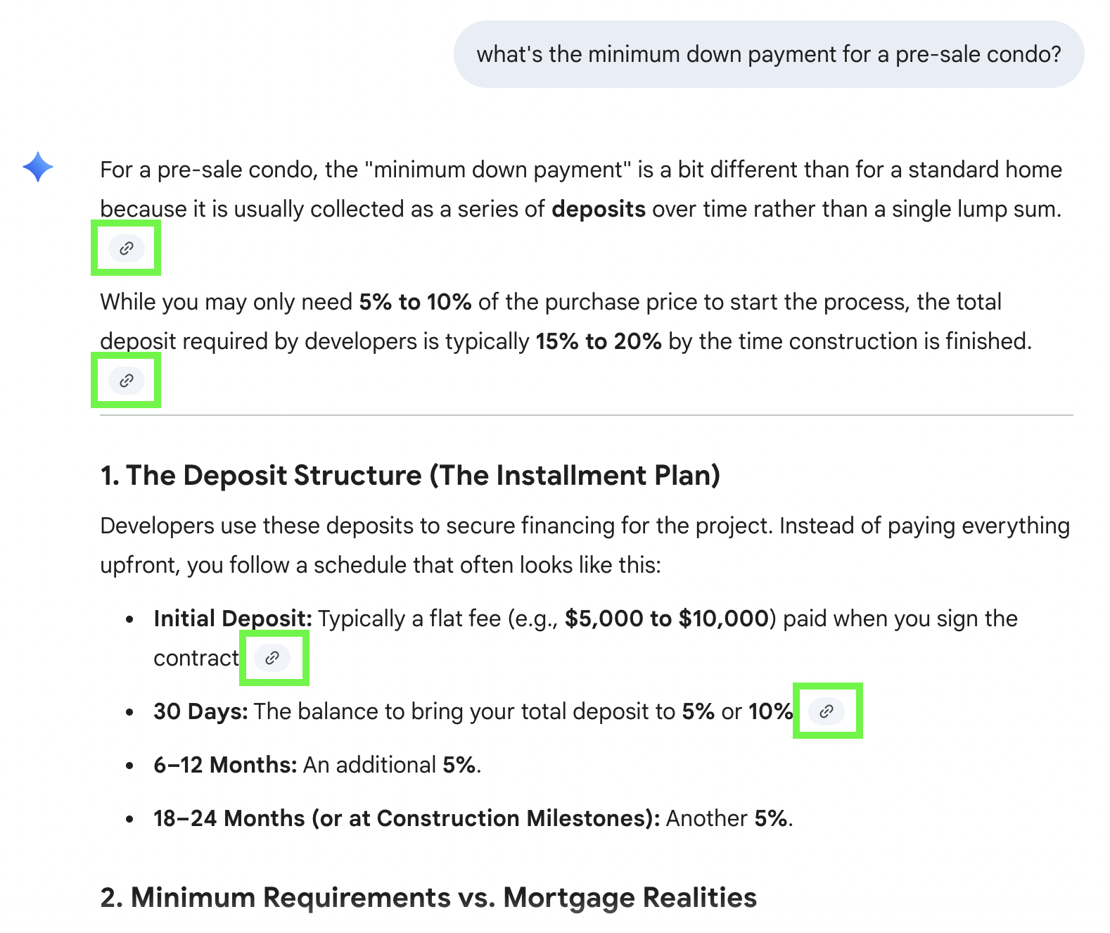 ChatGPT: No links for the prompt “what’s the minimum down payment for a pre-sale condo?”