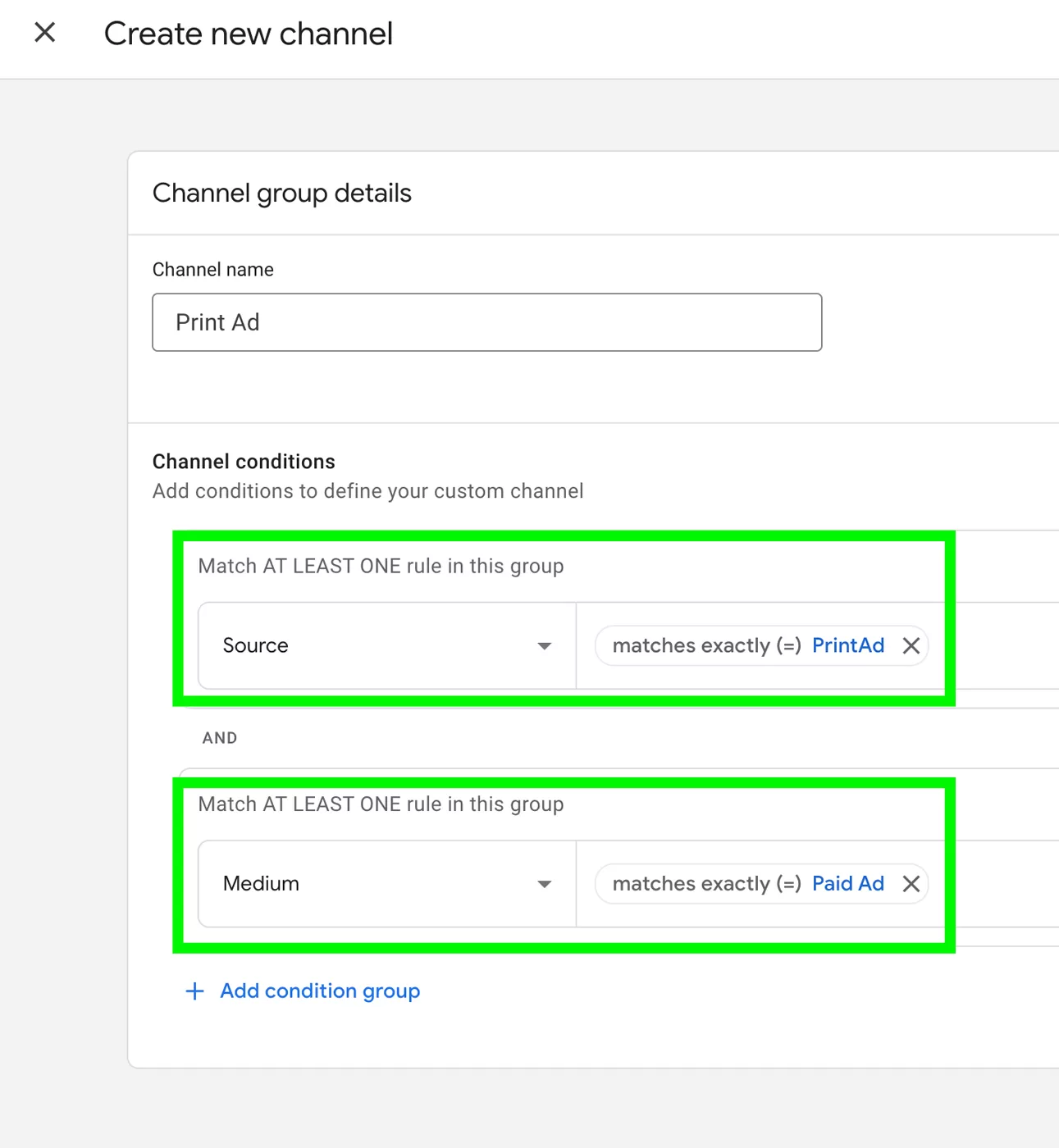 Create a condition for your channel group, for example, by grouping website traffic that comes from the source “PrintAd” and medium. Once you have created such a channel group, you will see it in your GA4 reports.