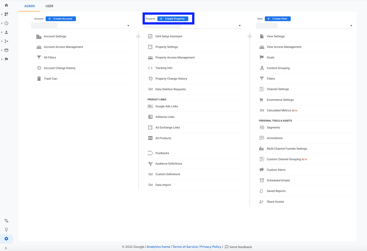 Go to your current Google Analytics Universal Analytics account and click on Create Property.